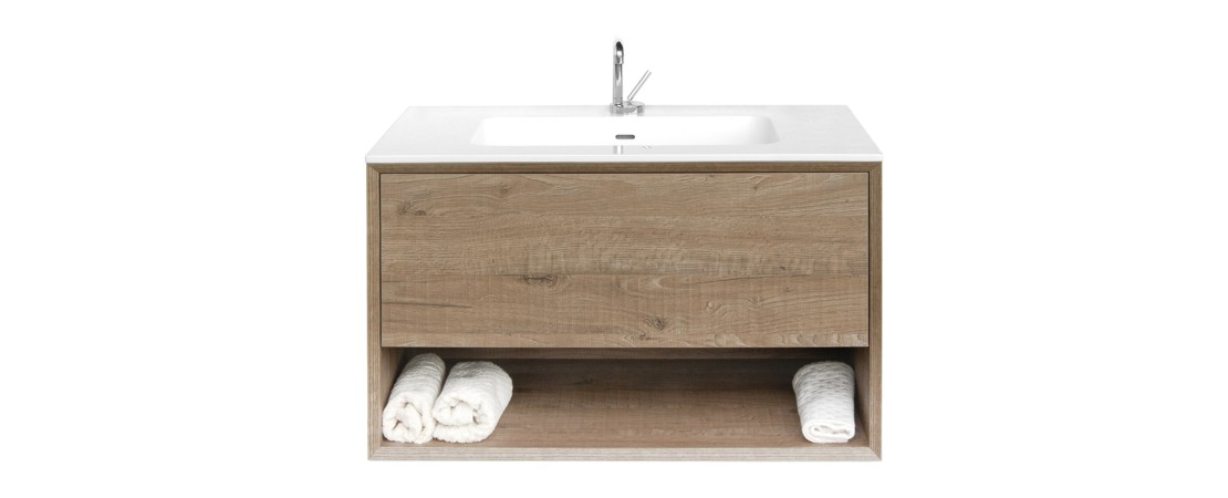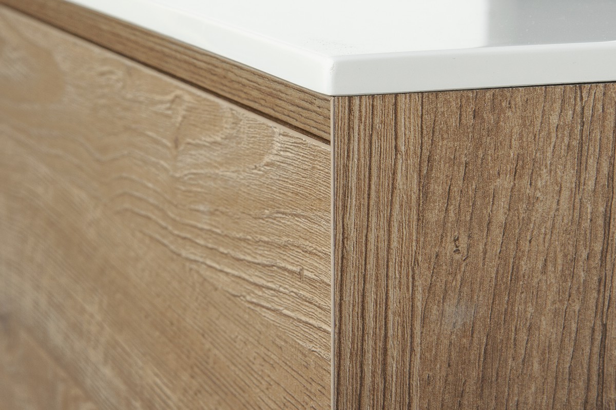 Console da bagno con cassetto in melaminico imitazione legno e piano lavabo integrato in Stonelight