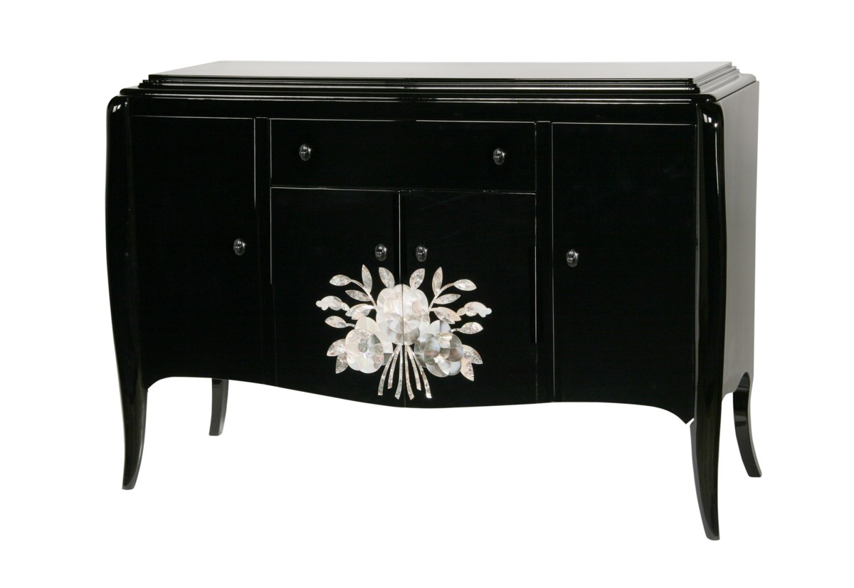 Credenzino in legno laccato lucido, 1 cassetto e 4 ante, con prezioso intarsio in vera Madreperla