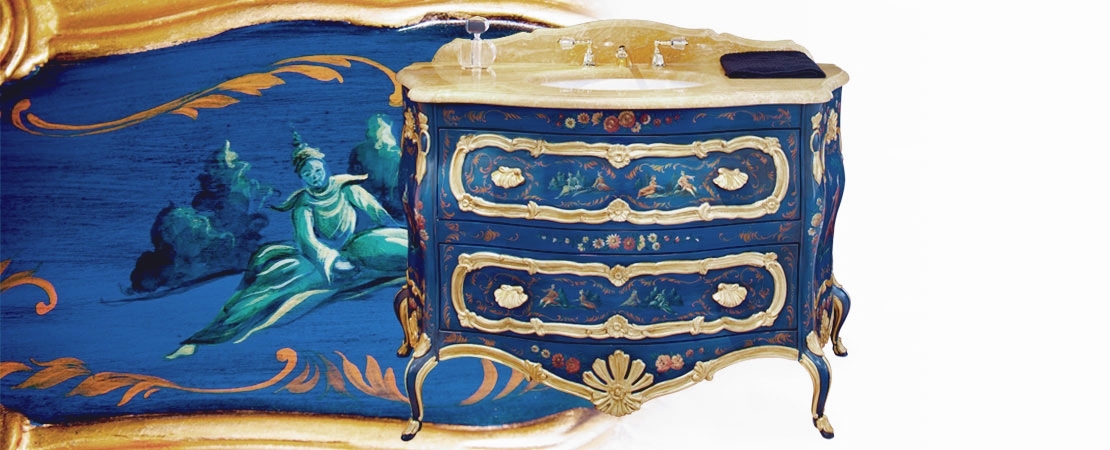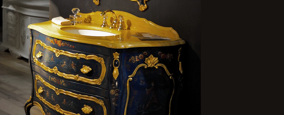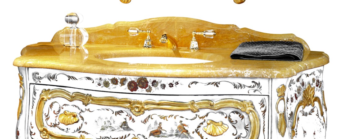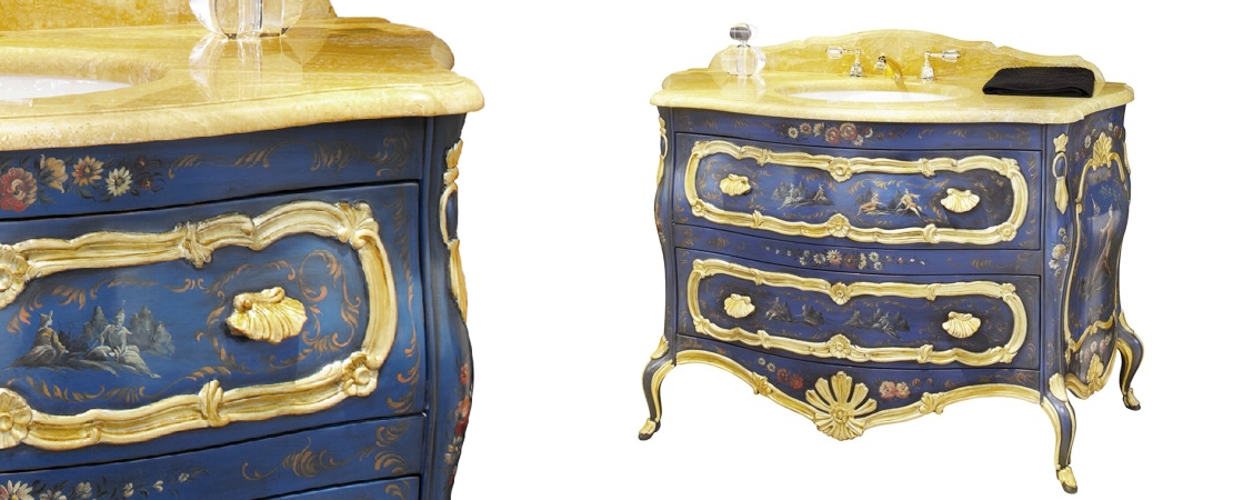 Mobile da bagno 8668 in legno intagliato a mano, con 2 cassetti e piano in marmo o travertino