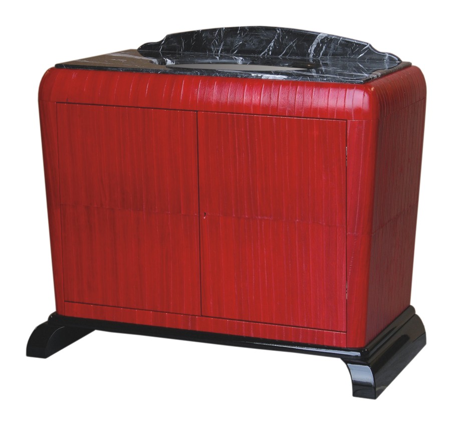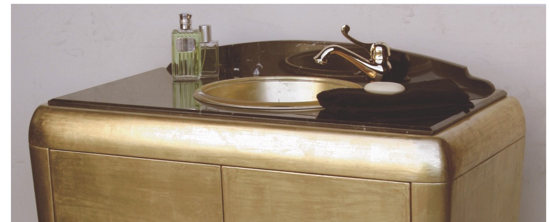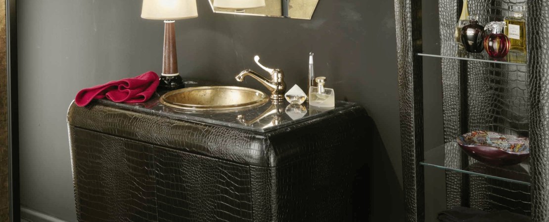 Mobile da bagno 2010 in legno con rivestimento vera pelle di Galuchat e particolari lacca nera con piano in marmo.