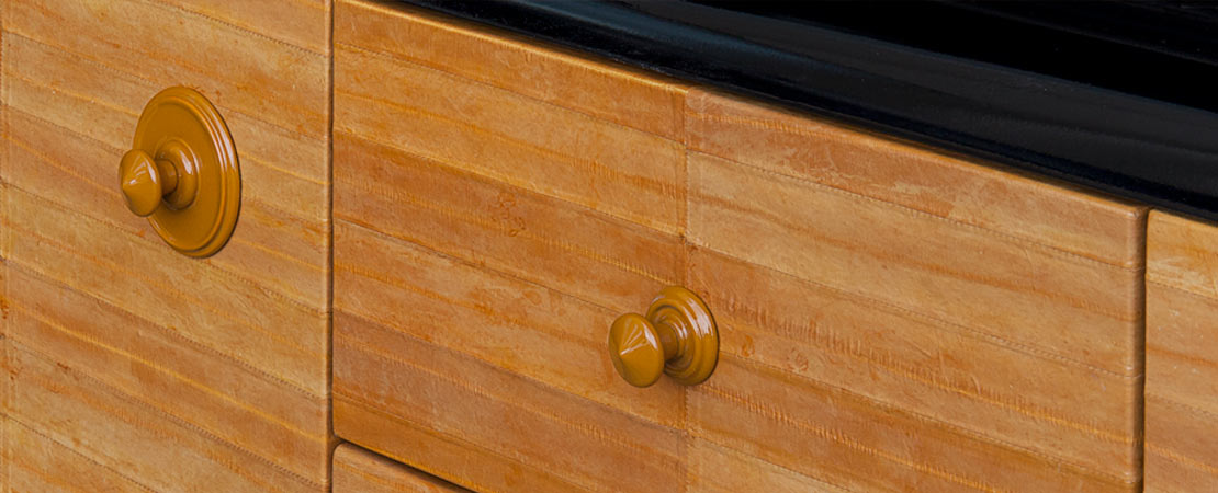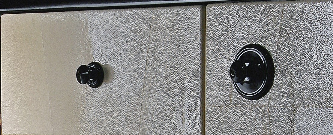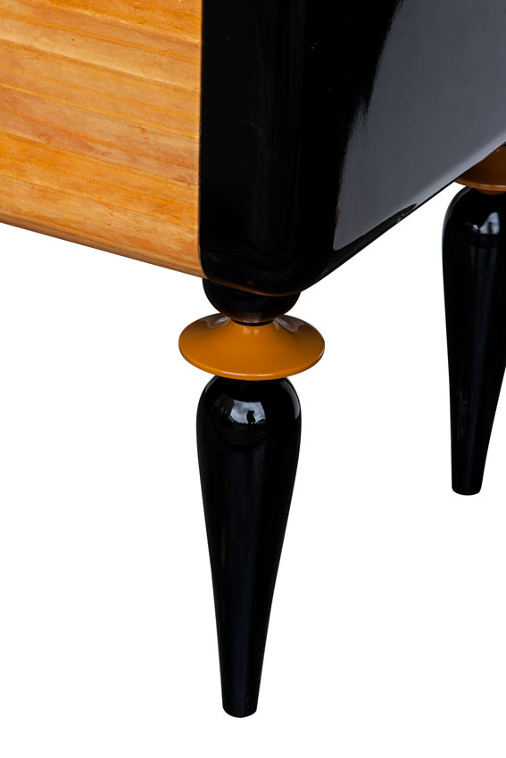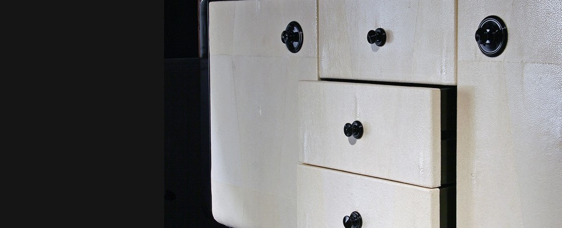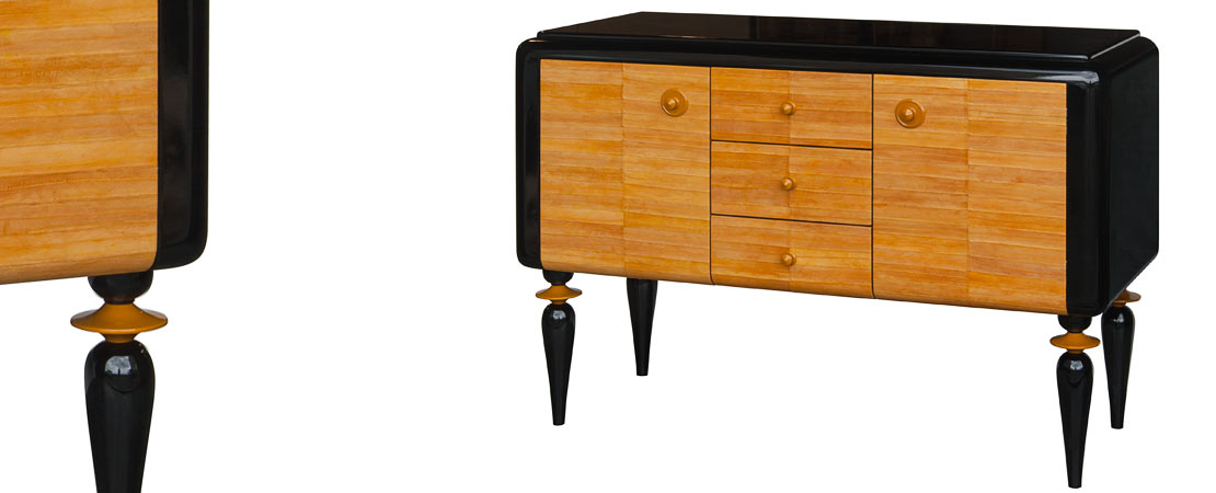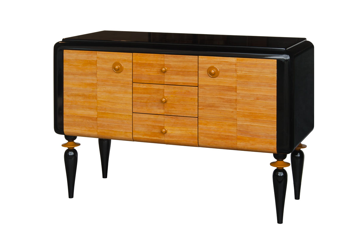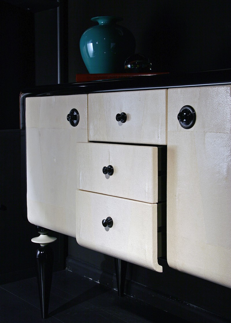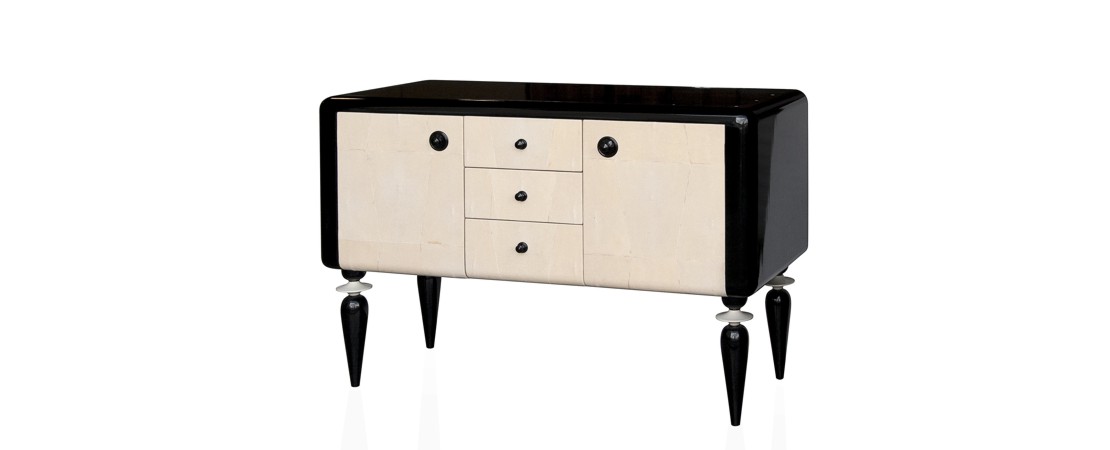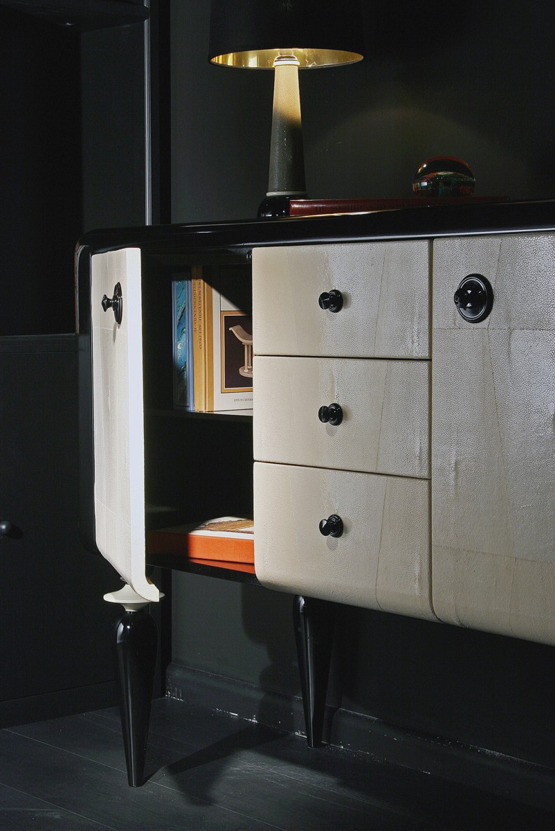 Sideboard in glossy lacquered wood with 3 drawers and doors with shagreen or eel leather covering