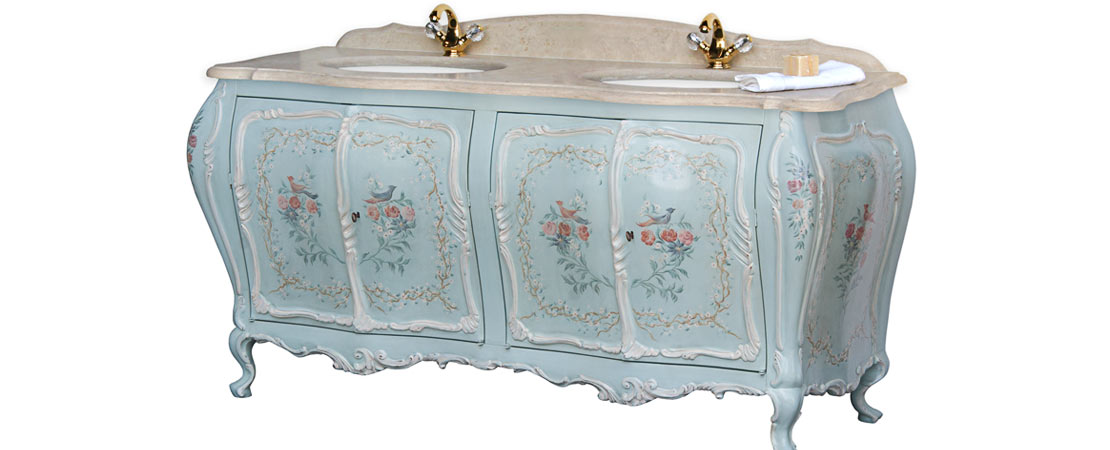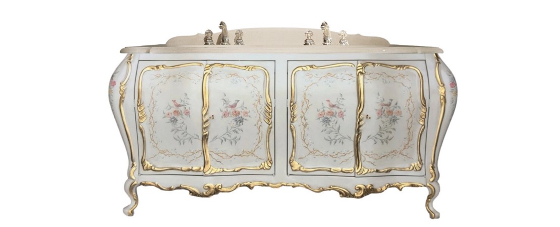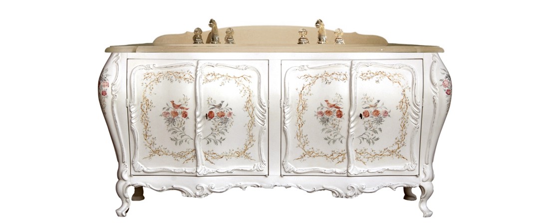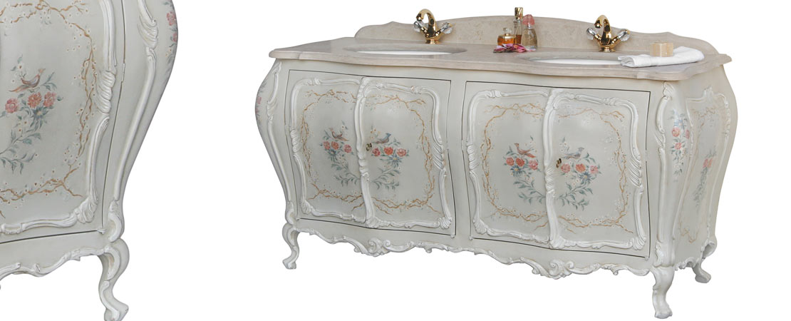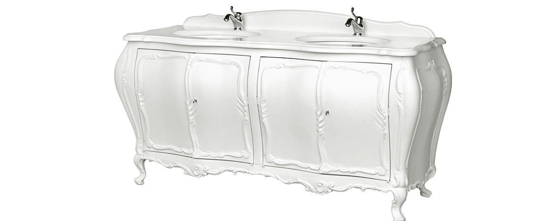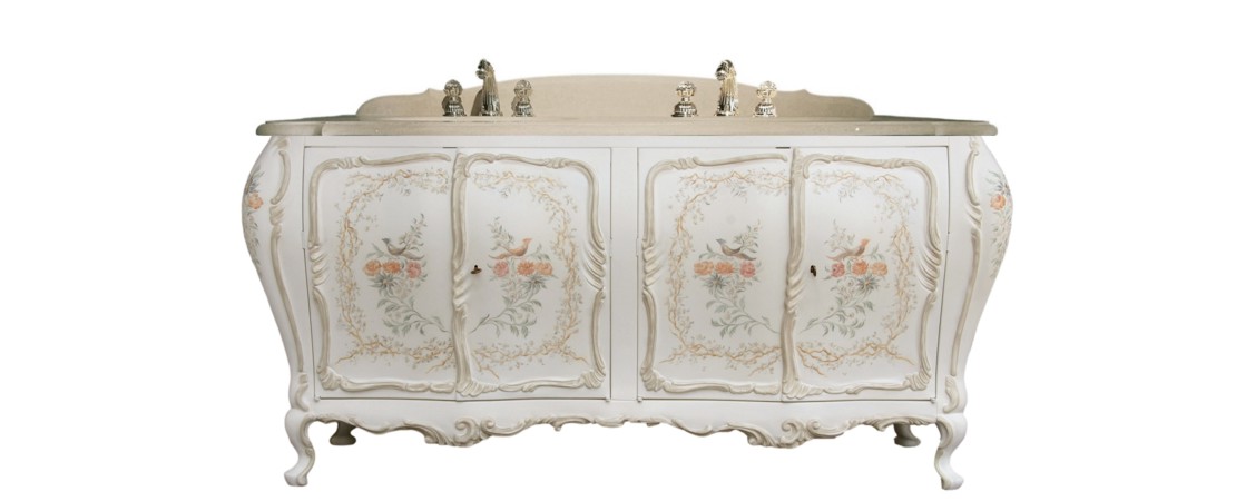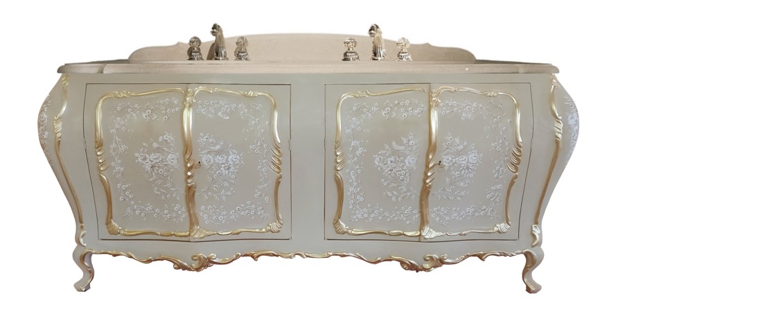 Vanity unit in carved wood, double basin, with marble or travertine top