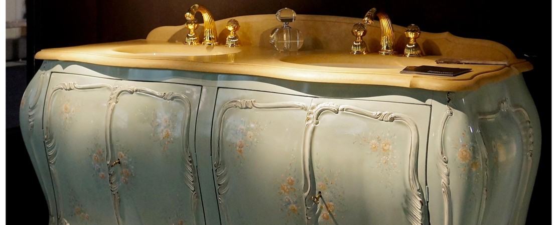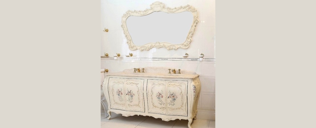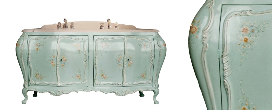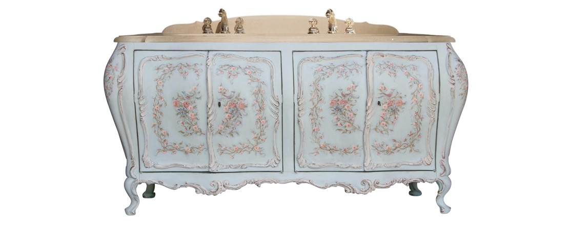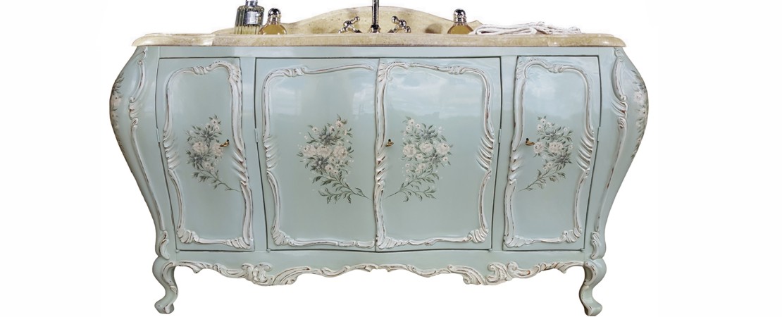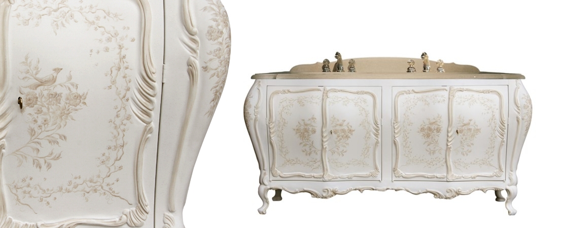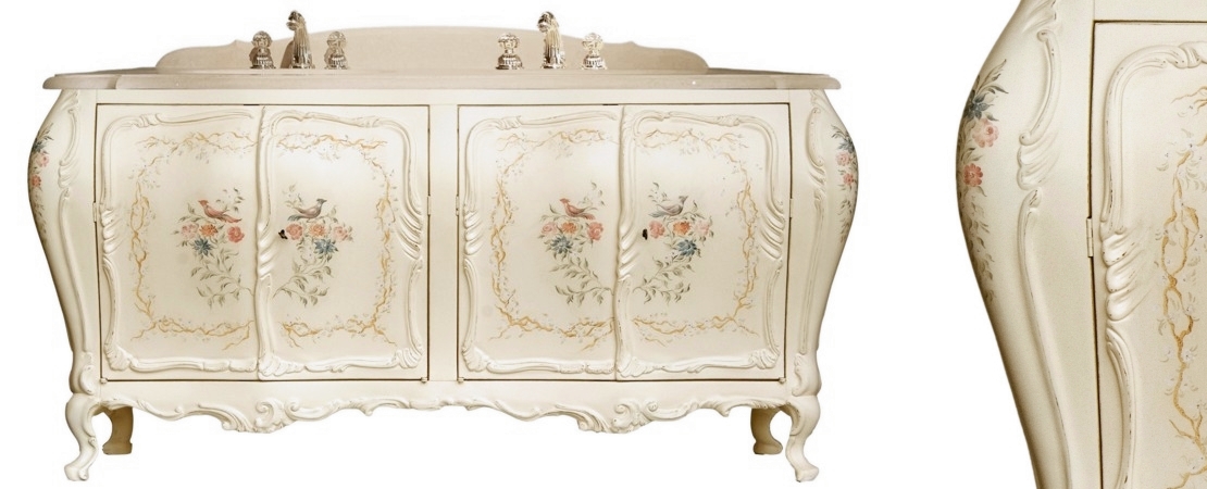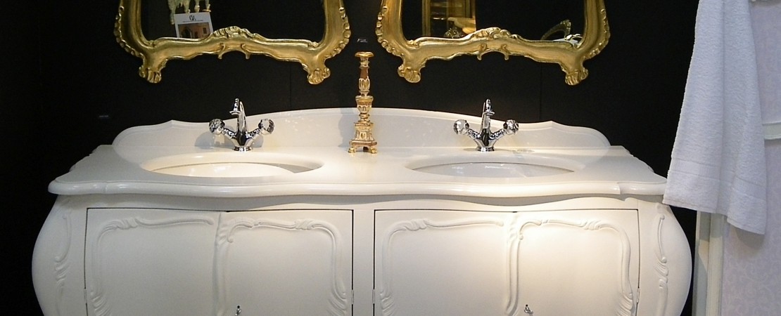 Vanity unit in carved wood, double basin, with marble or travertine top