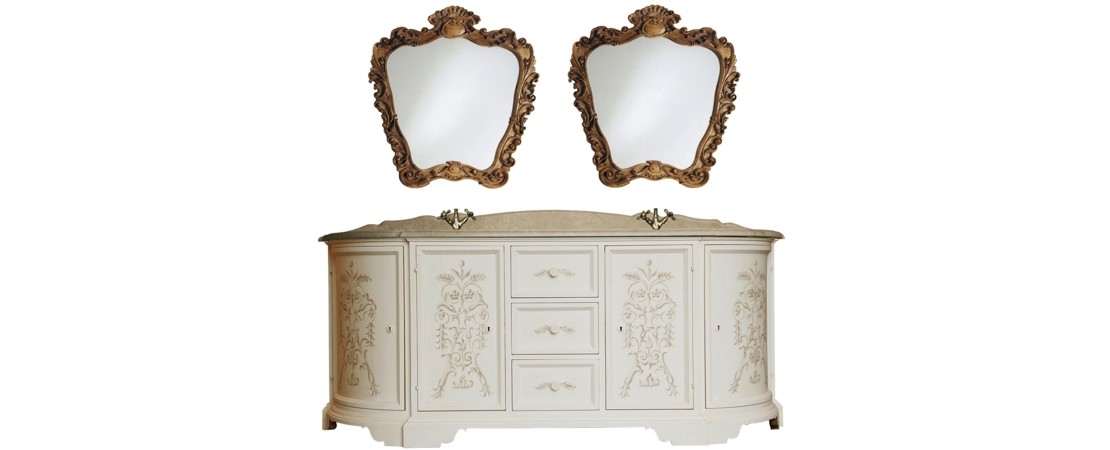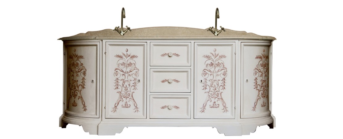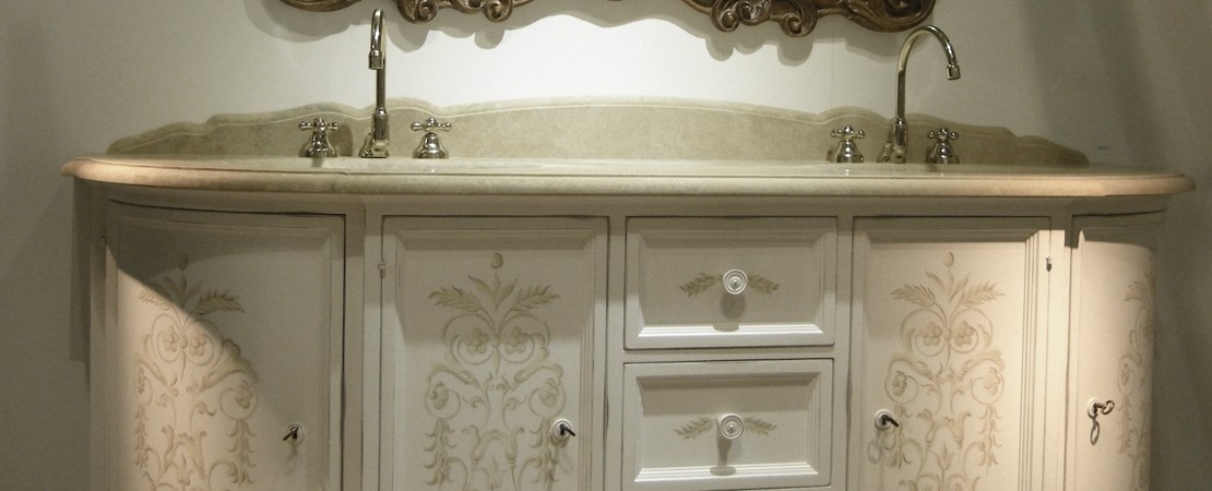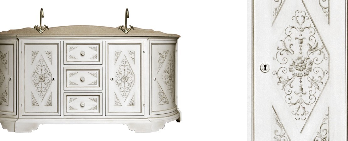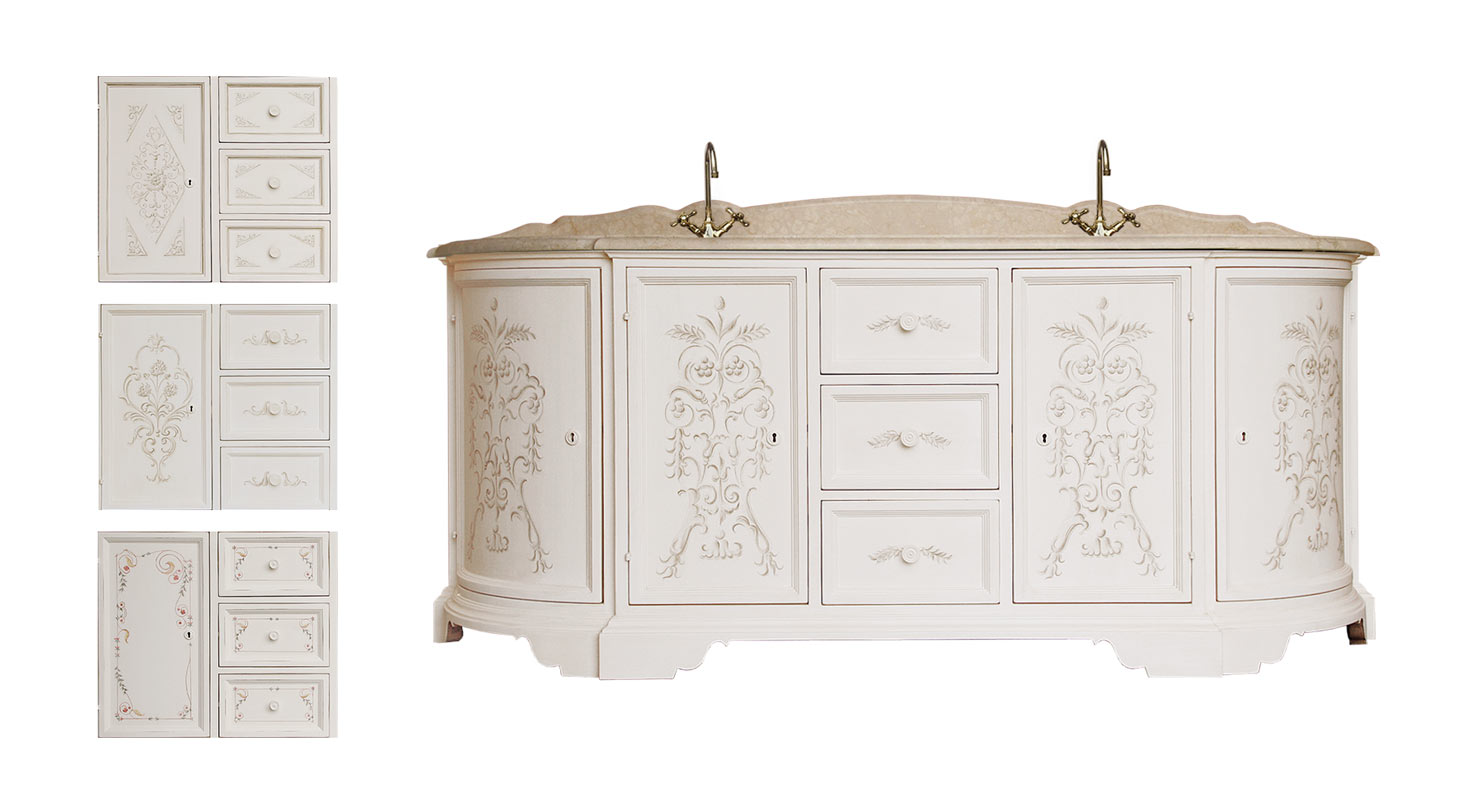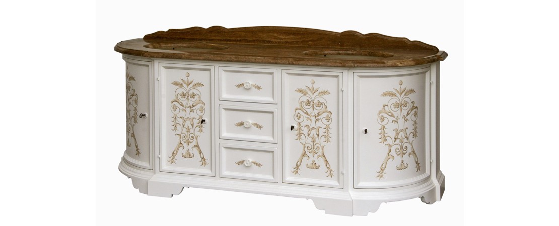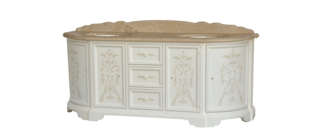 Vanity unit double basin in wood with 3 drawers and 4 doors, with marble or travertine top