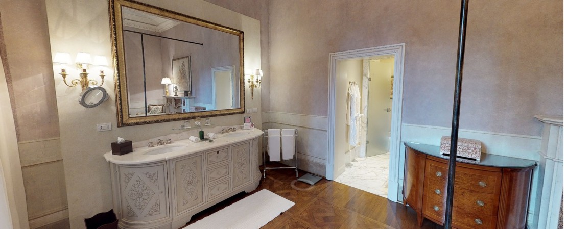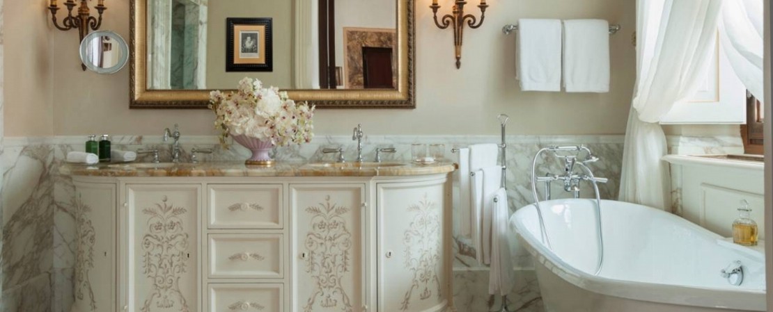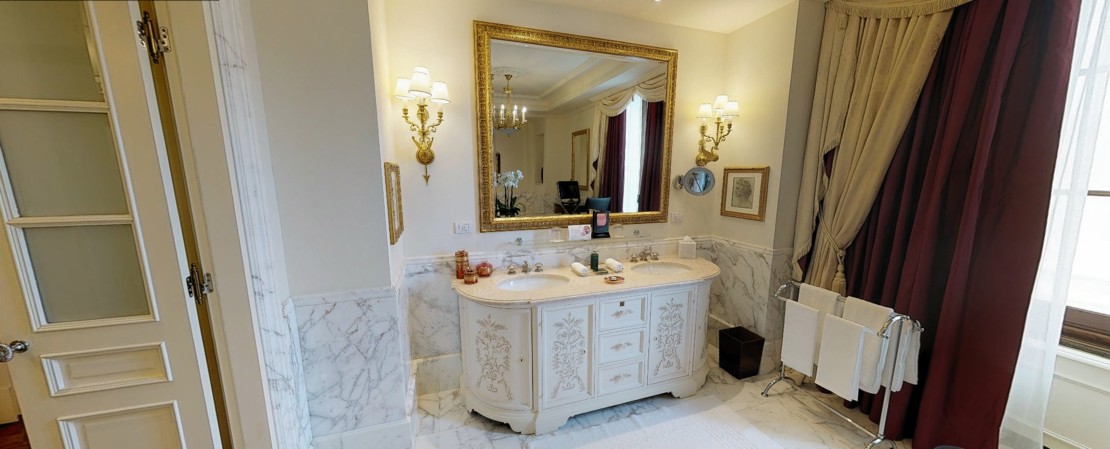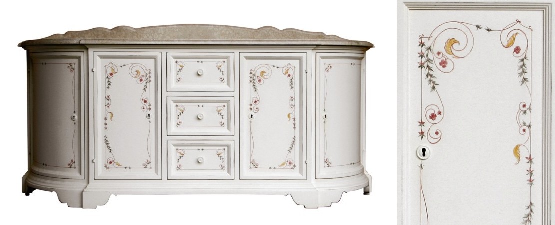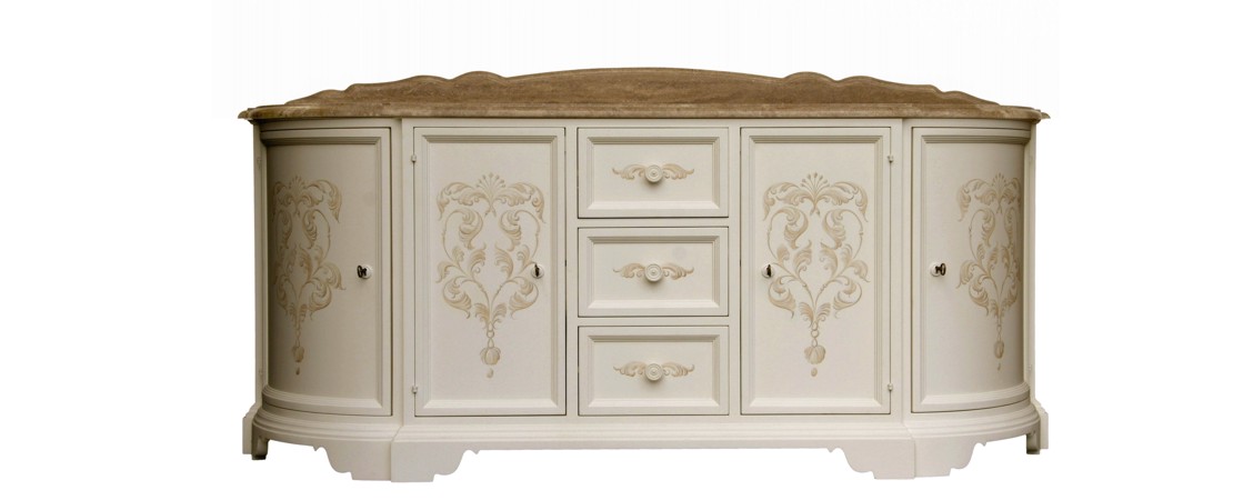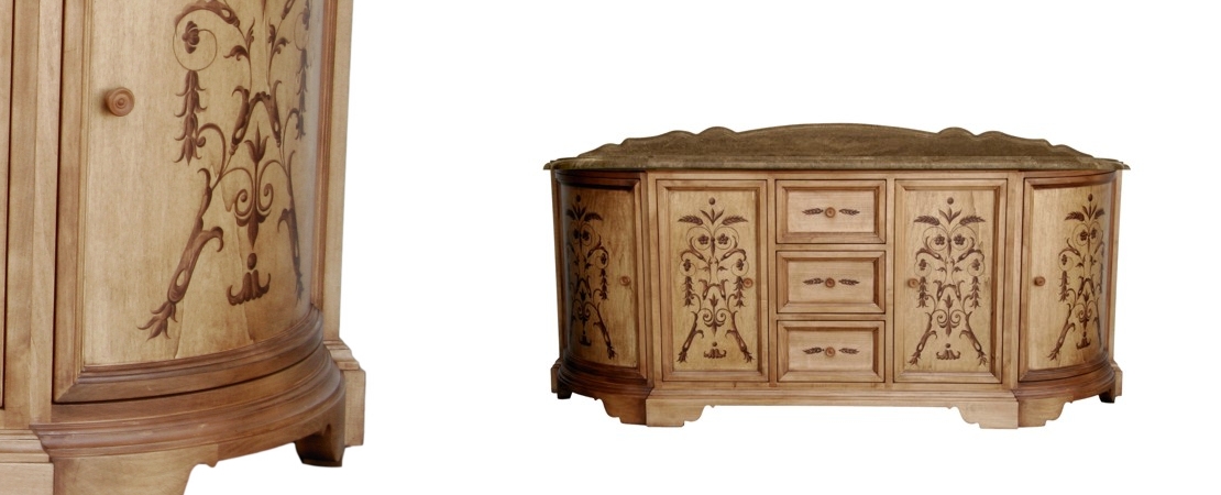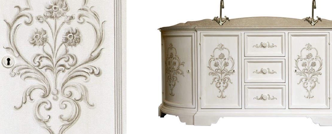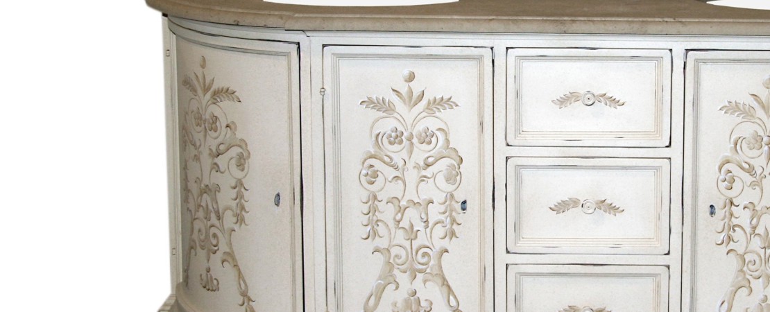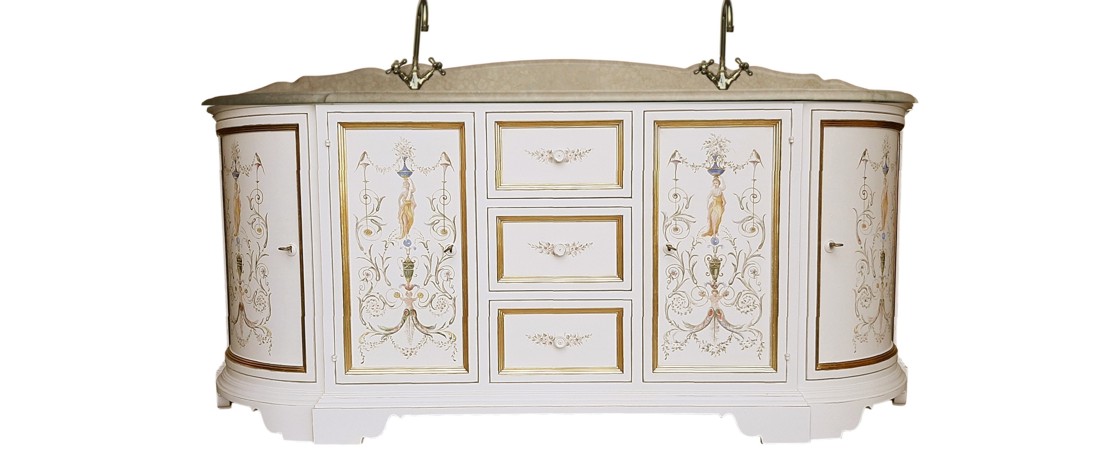 Vanity unit double basin in wood with 3 drawers and 4 doors, with marble or travertine top