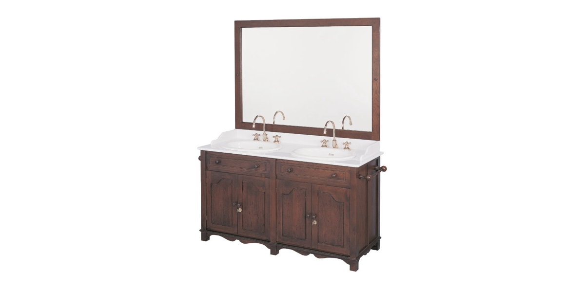 Vanity unit double basin in wood with mirror and white Carrara marble top