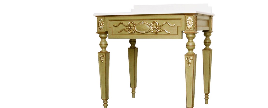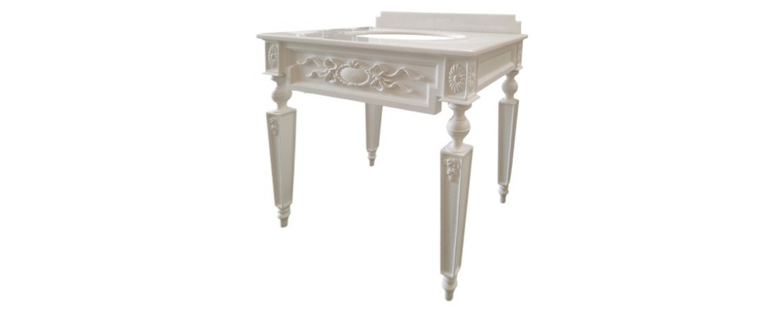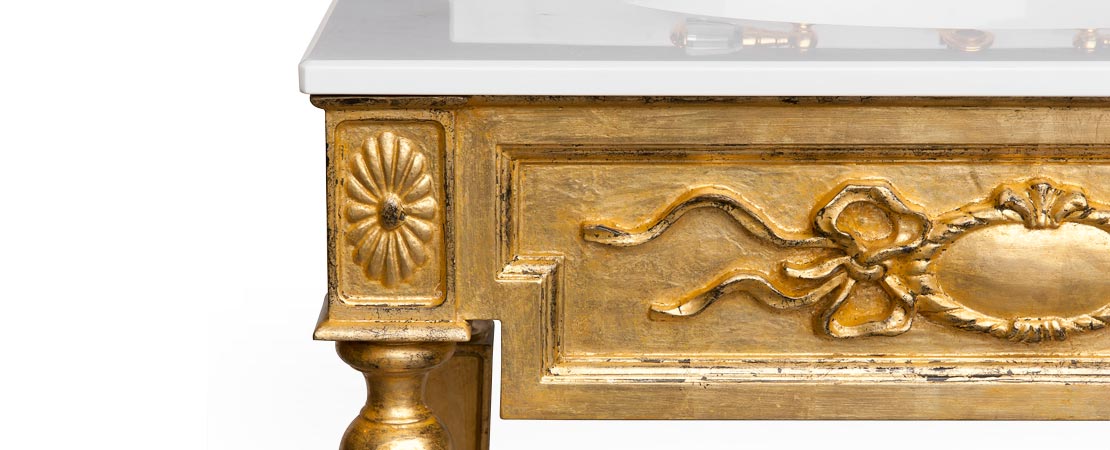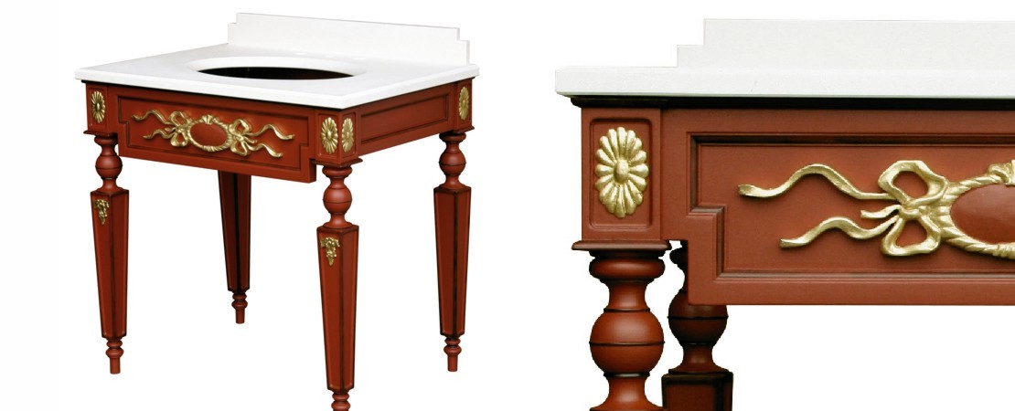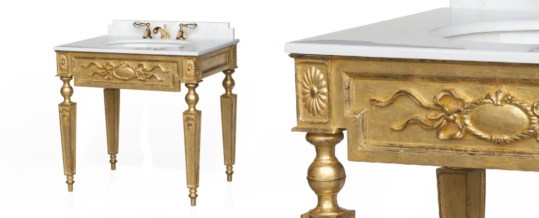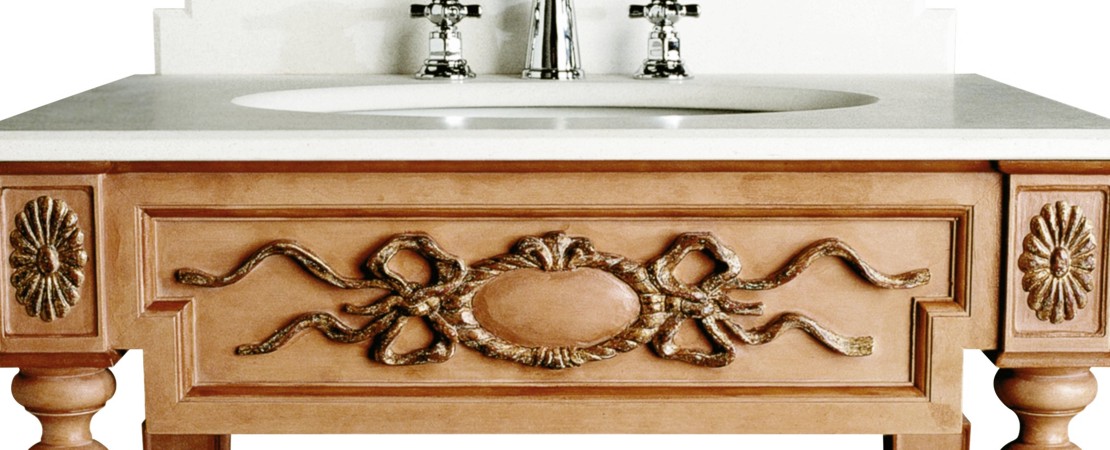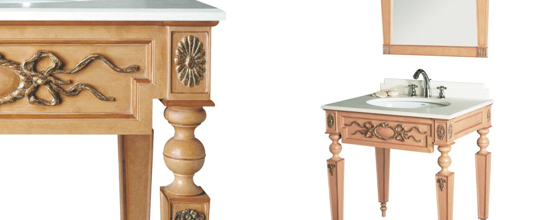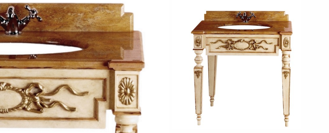 Vanity unit in wood with carvings, with mirror and marble or travertine top