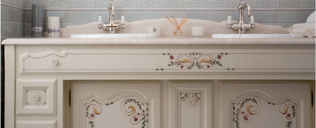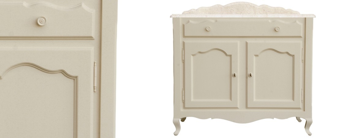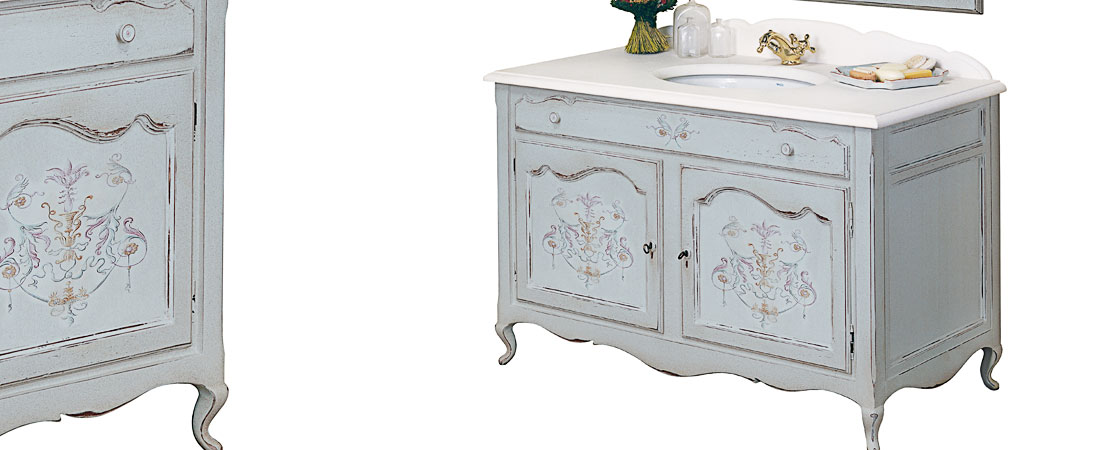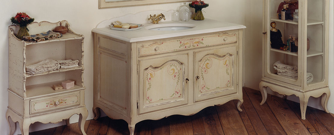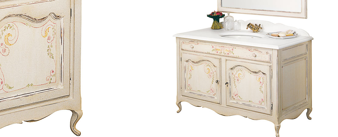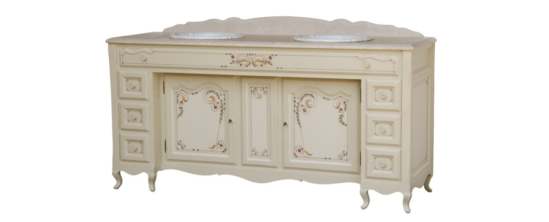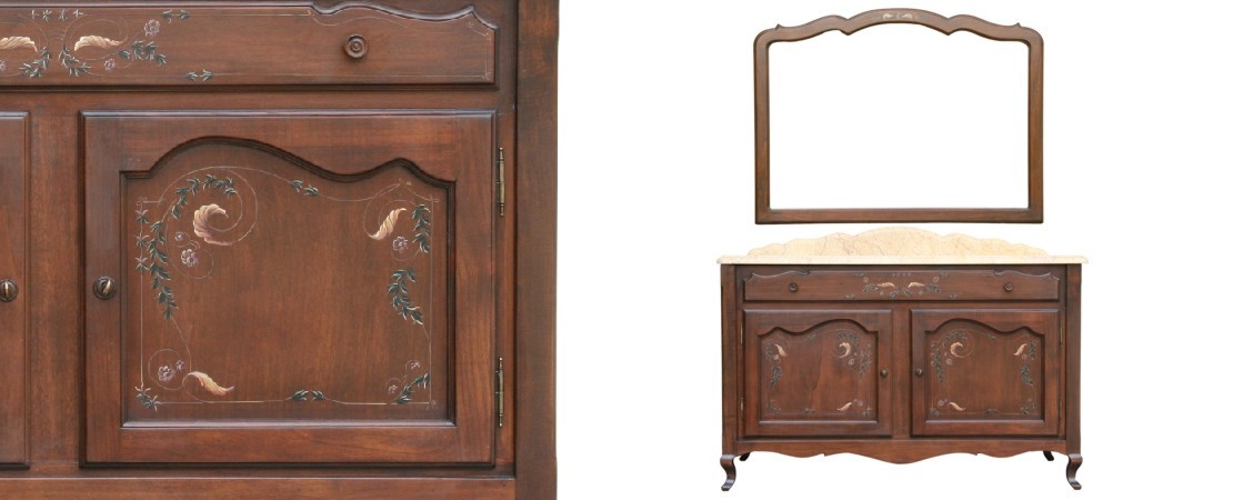 Vanity unit provencal style in wood, with mirror and marble or travertine top