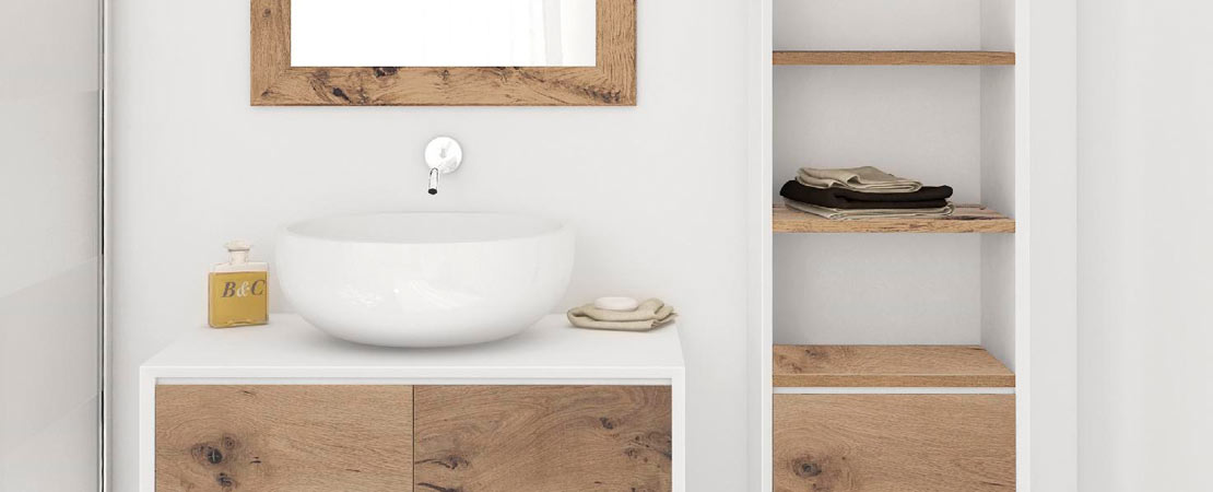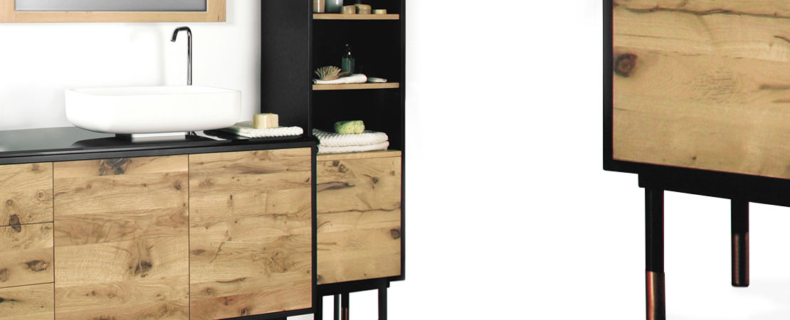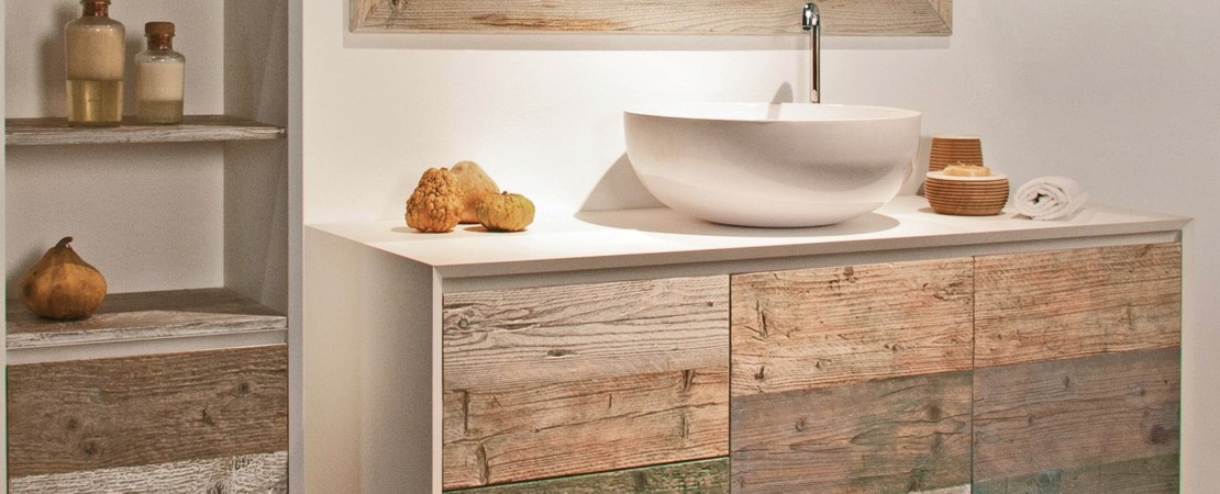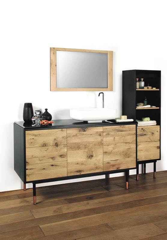 Etagere unit in matt white lacquered wood with door and shelves in reclaimed Fir wood