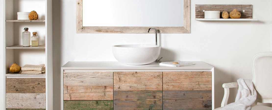 Vanity unit 2262/140 in matt lacquered wood with 2 drawers and doors in reclaimed Fir wood, with Stonelight top