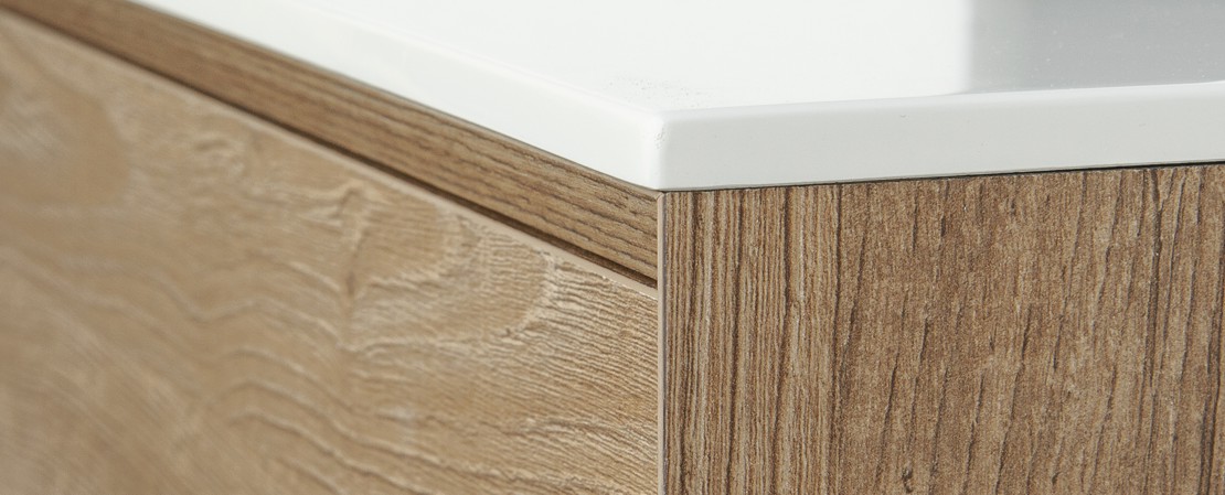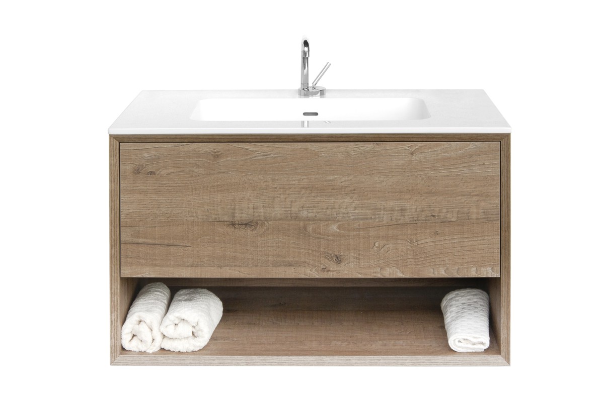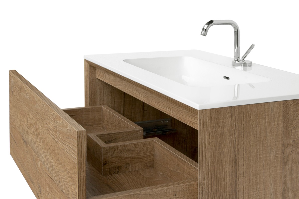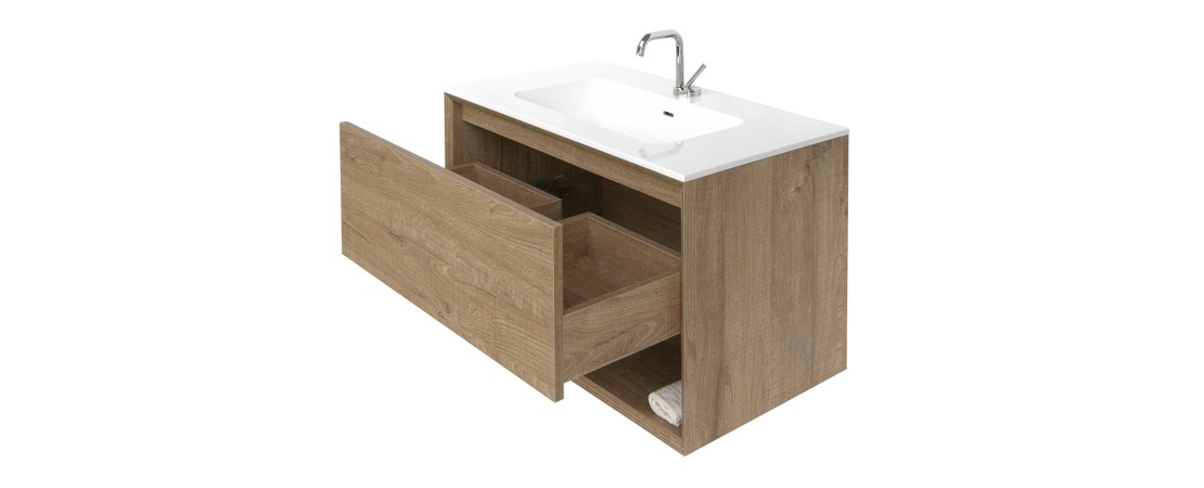 Console da bagno con cassetto in melaminico imitazione legno e piano lavabo integrato in Stonelight