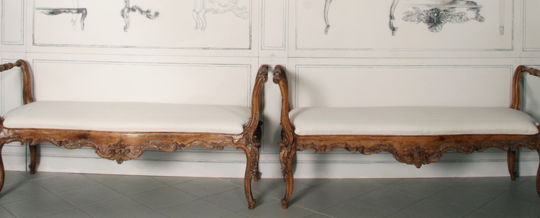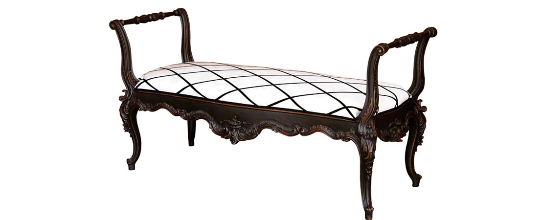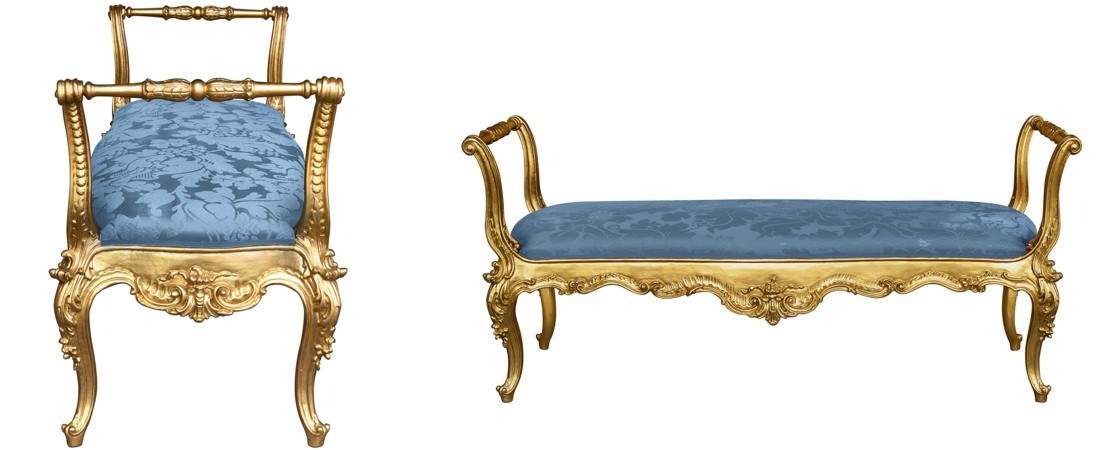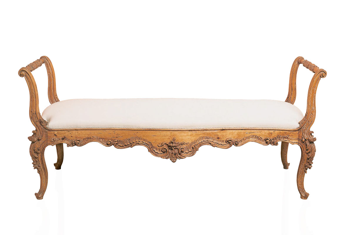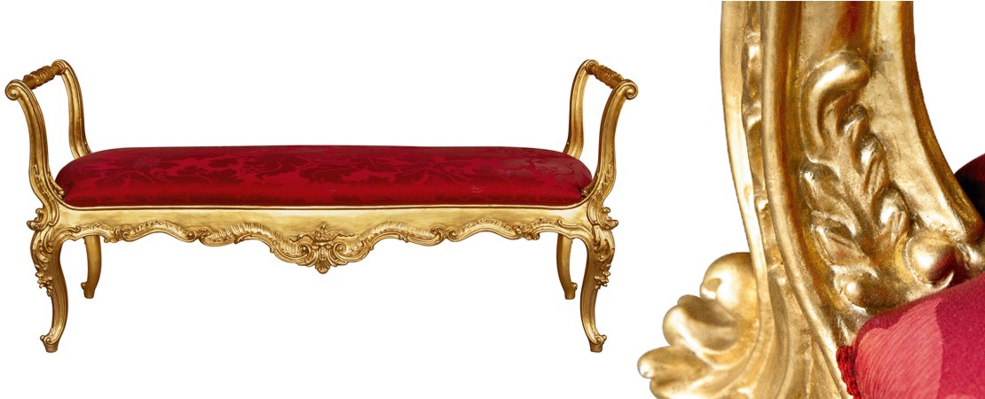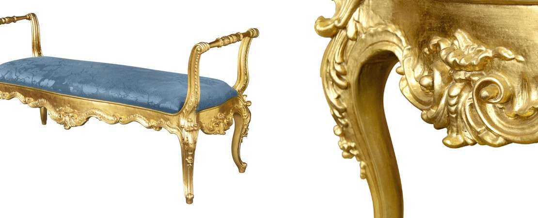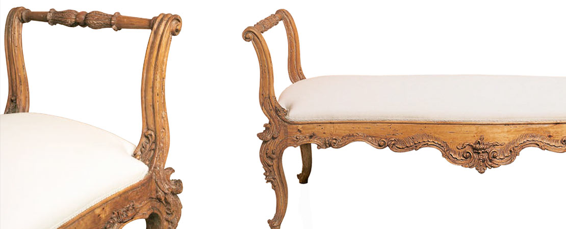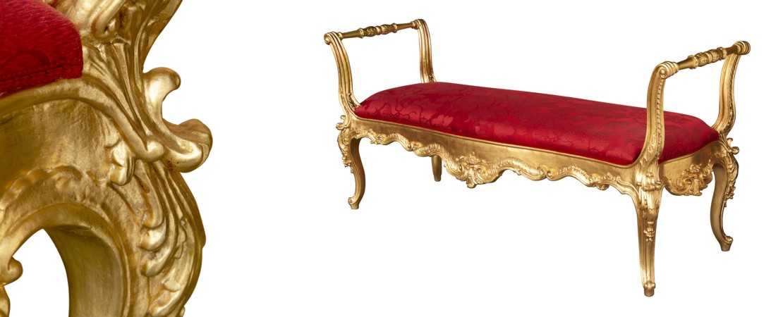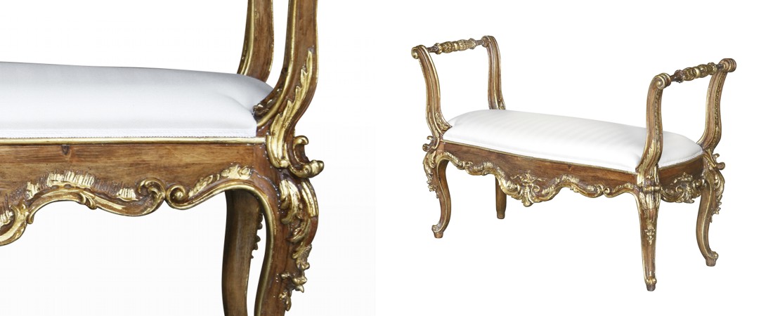 Divanetto in legno intagliato a mano con rivestimento in tessuto
