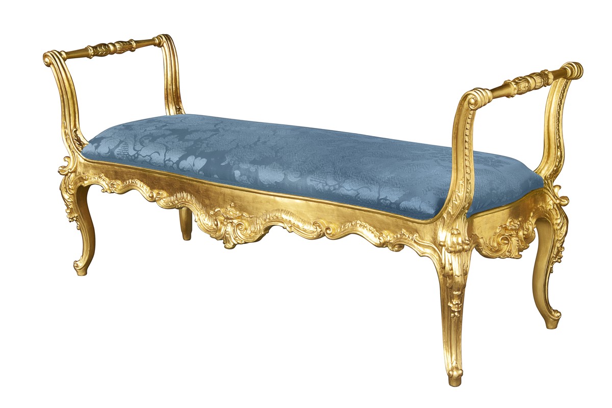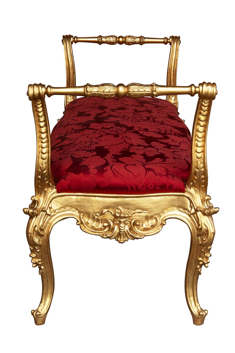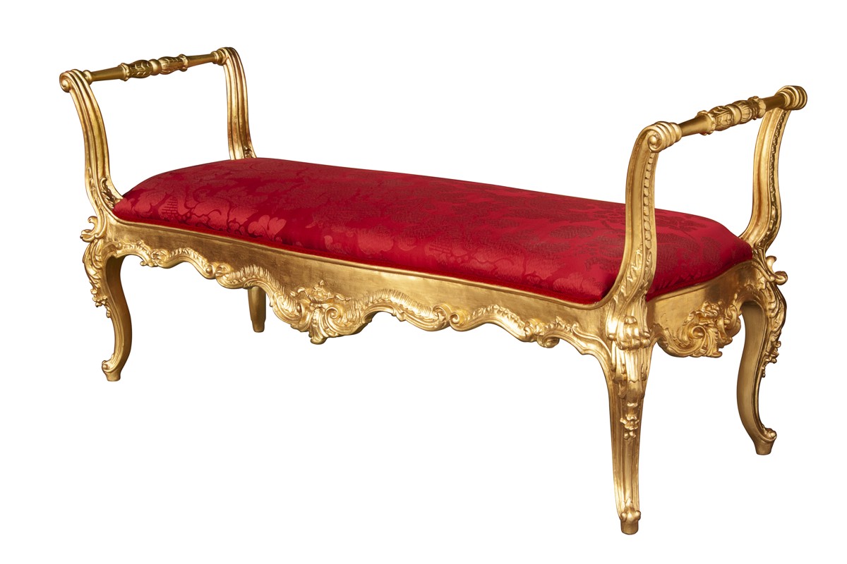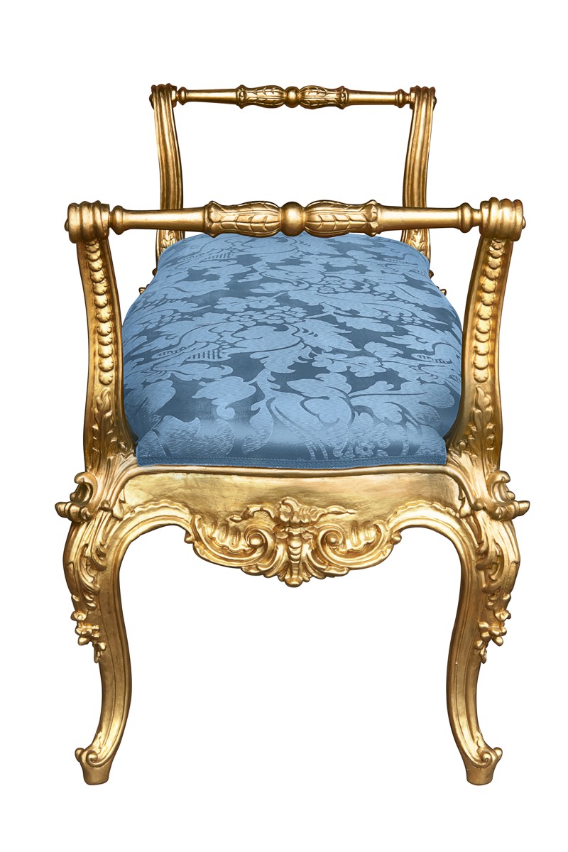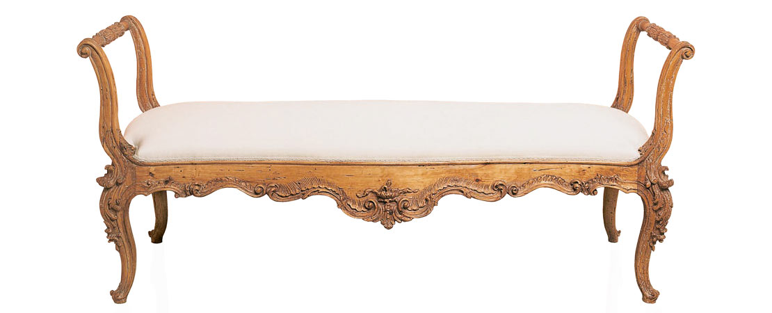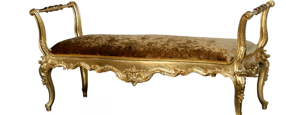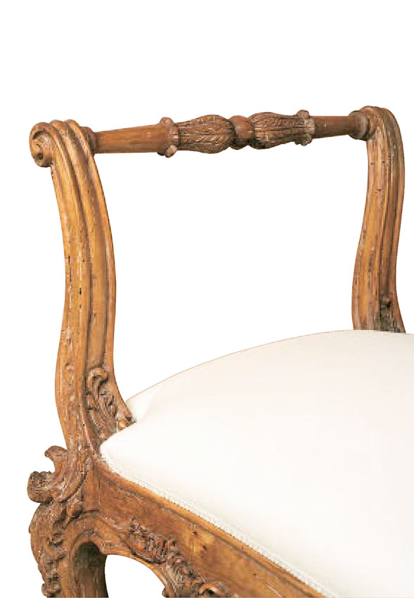 Divanetto in legno intagliato a mano con rivestimento in tessuto