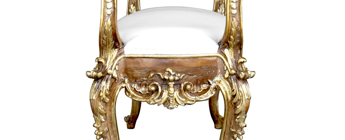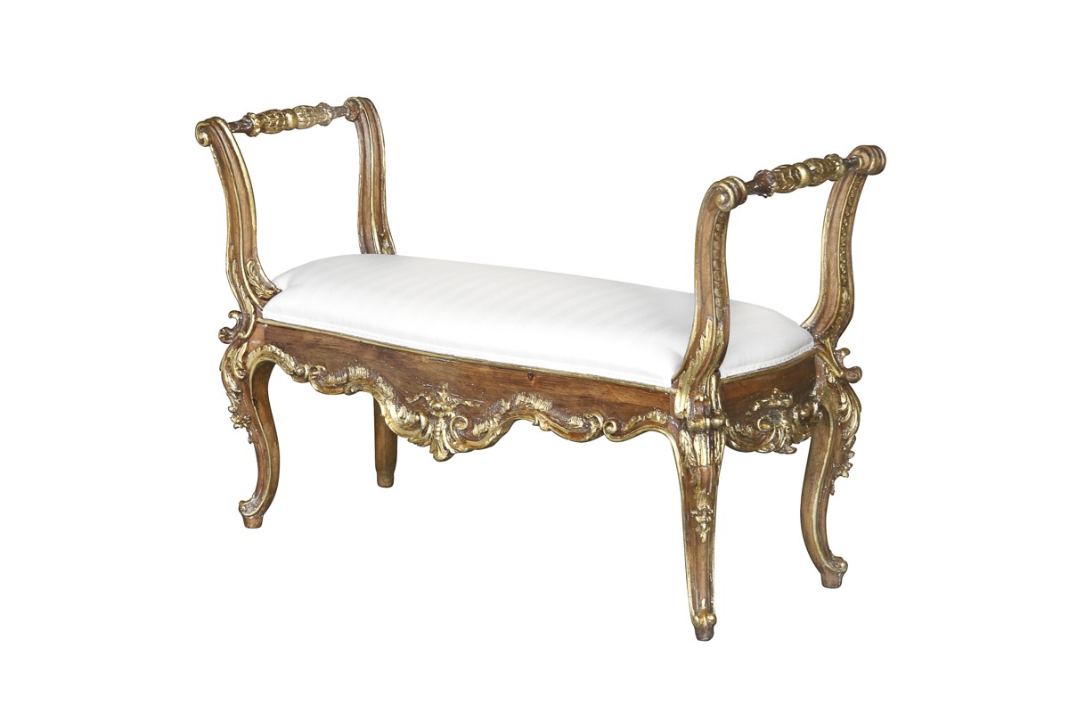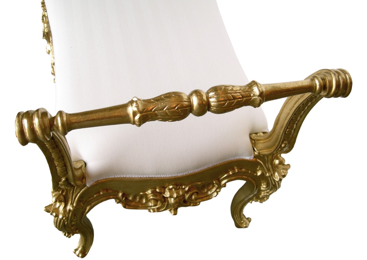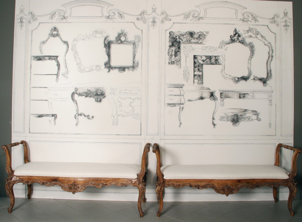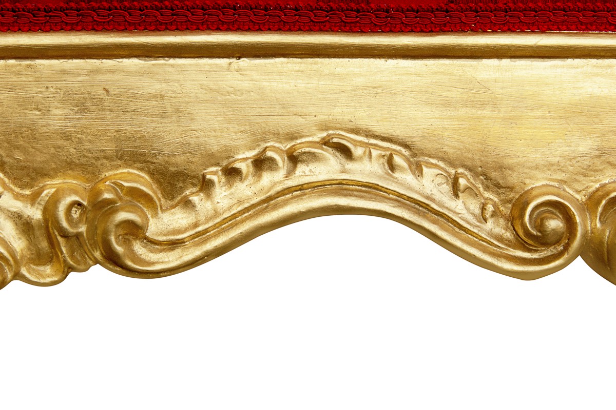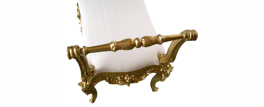 Divanetto in legno intagliato a mano con rivestimento in tessuto