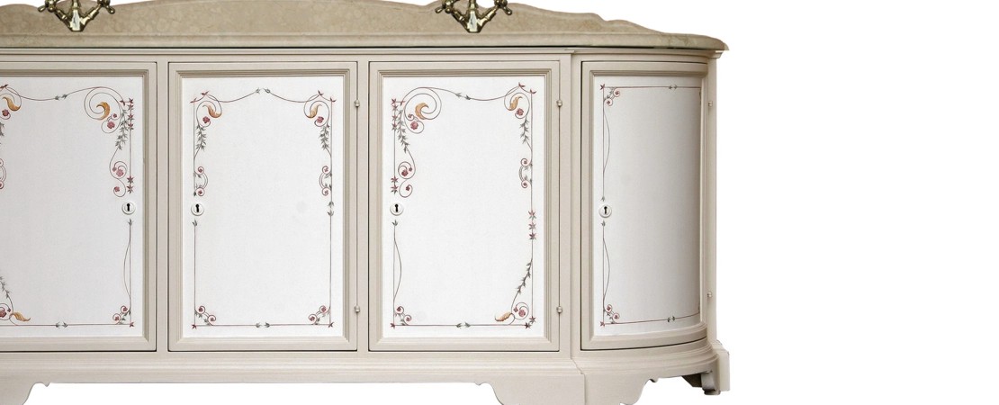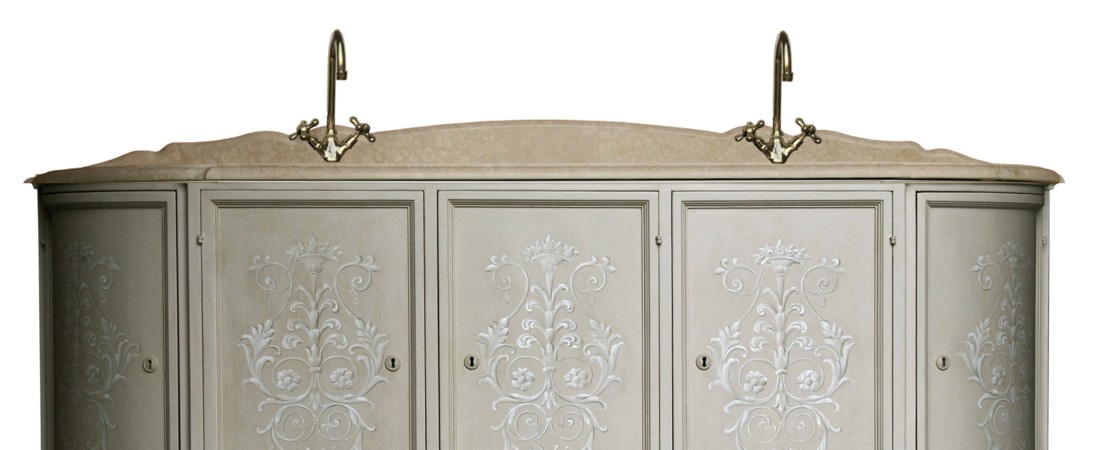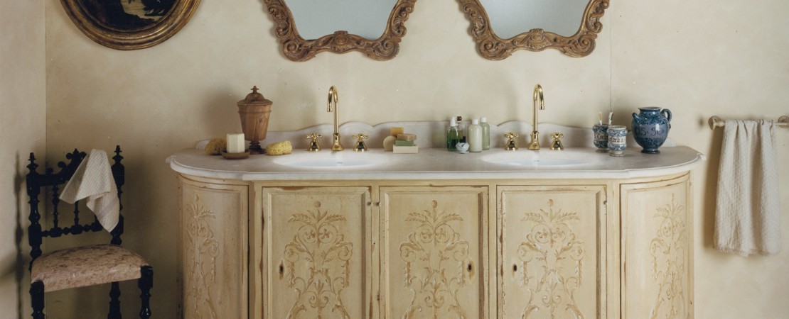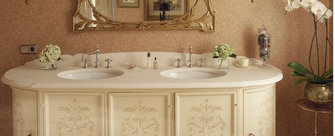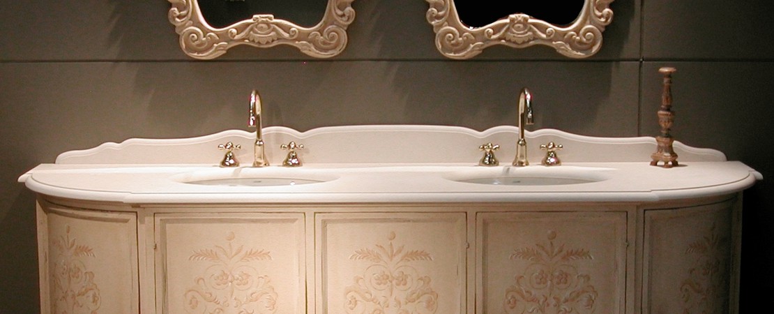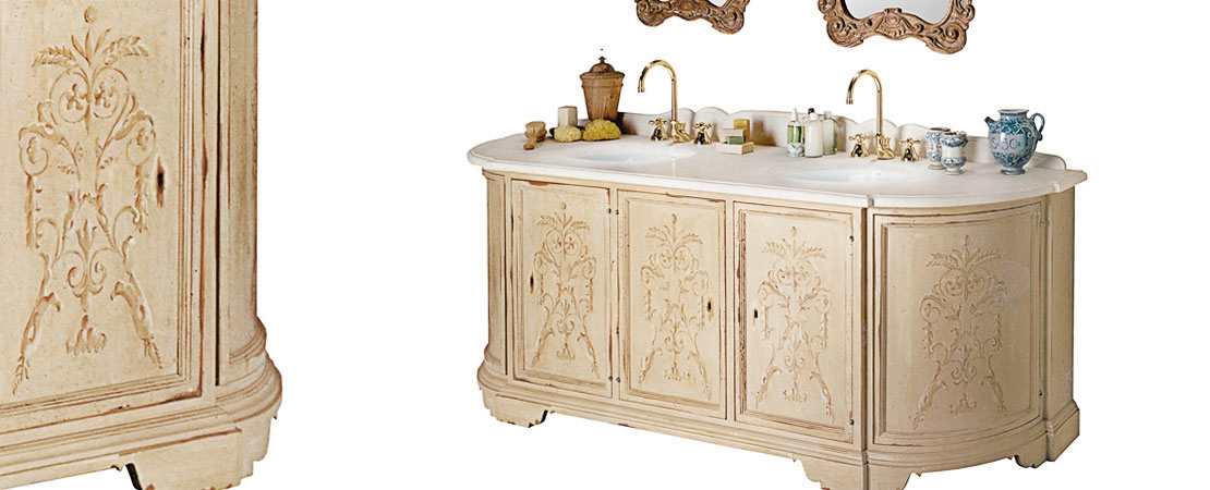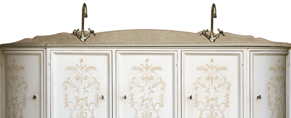 Mobile da bagno in legno doppio lavabo, con 5 ante e con piano in marmo o travertino