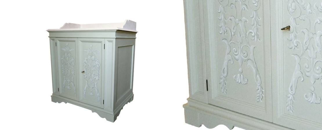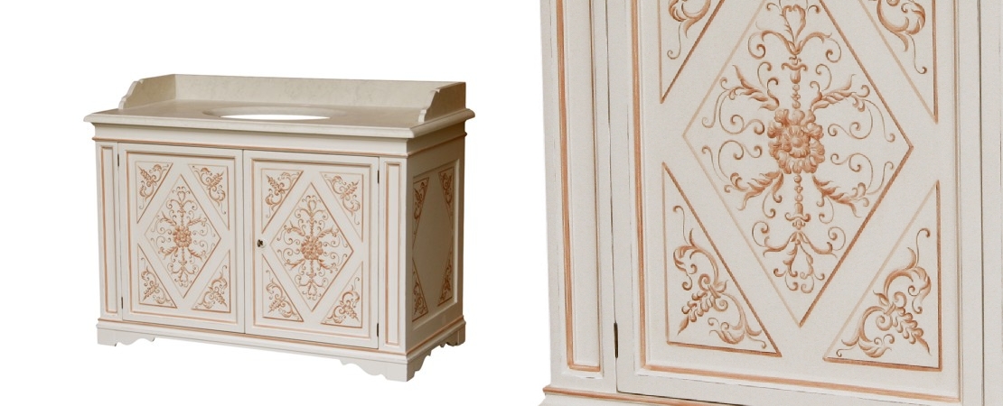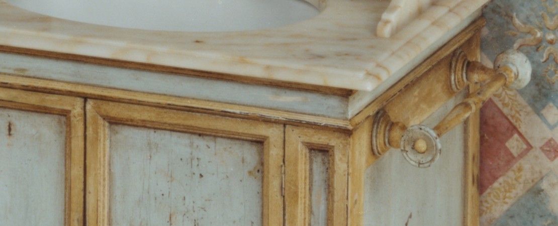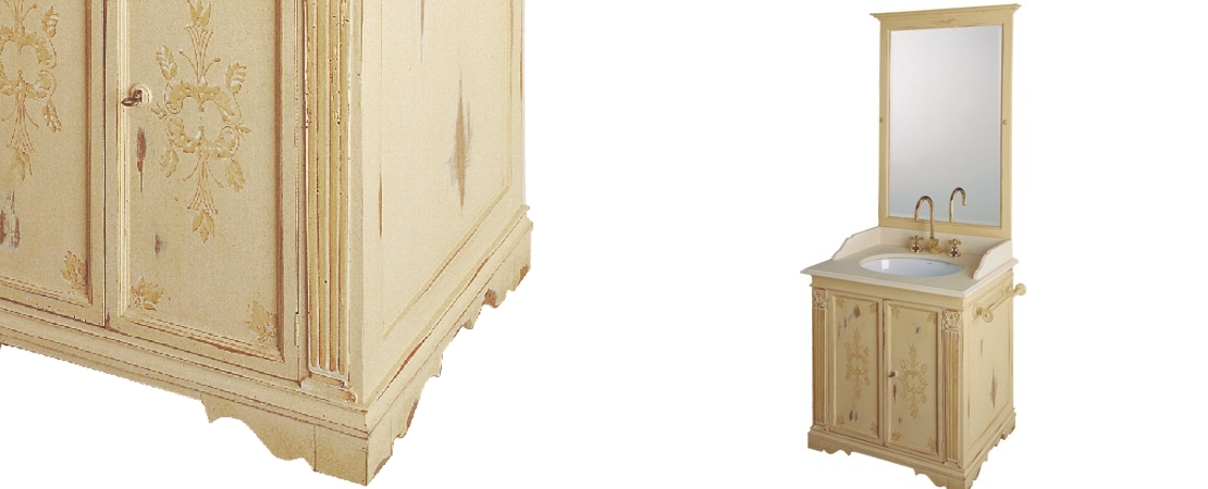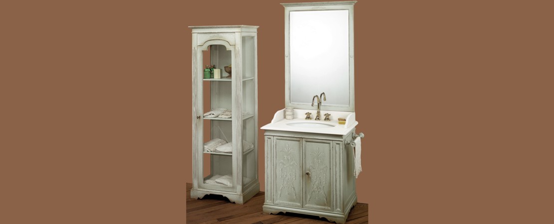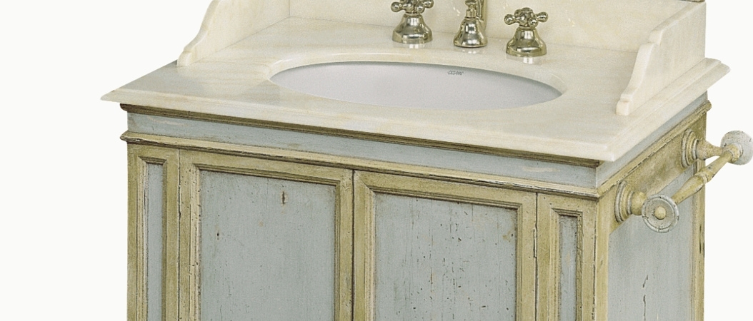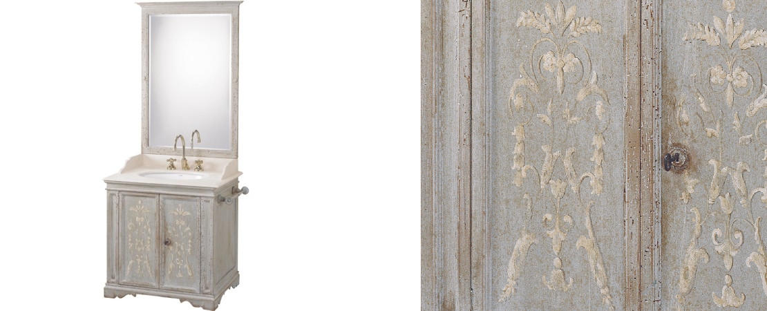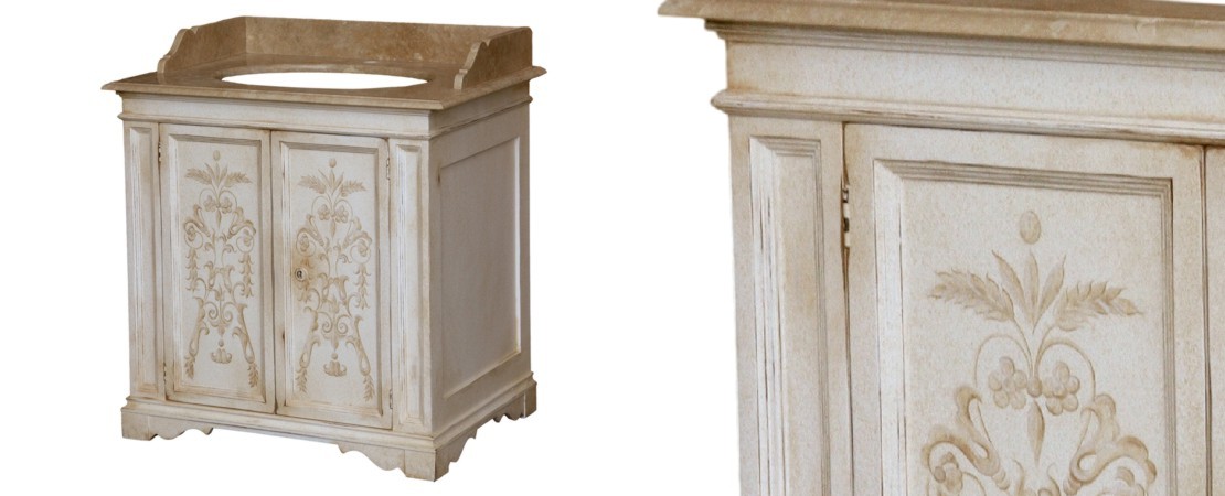 Mobile da bagno in legno con specchio e piano in marmo o travertino