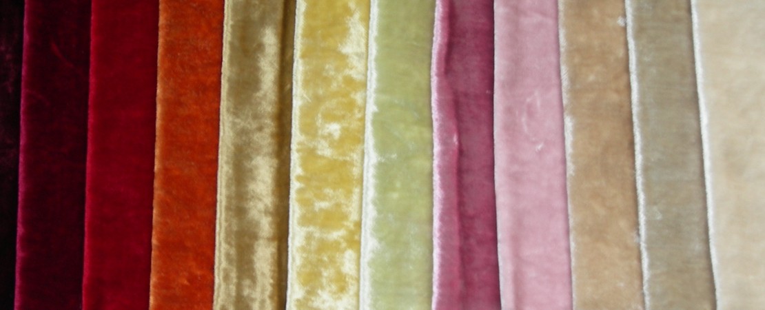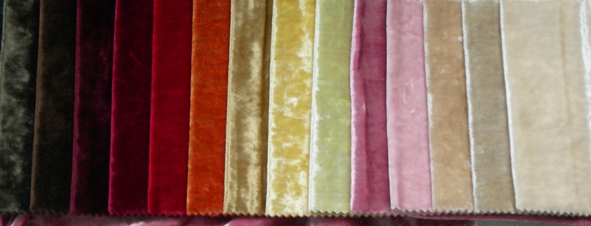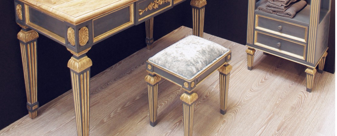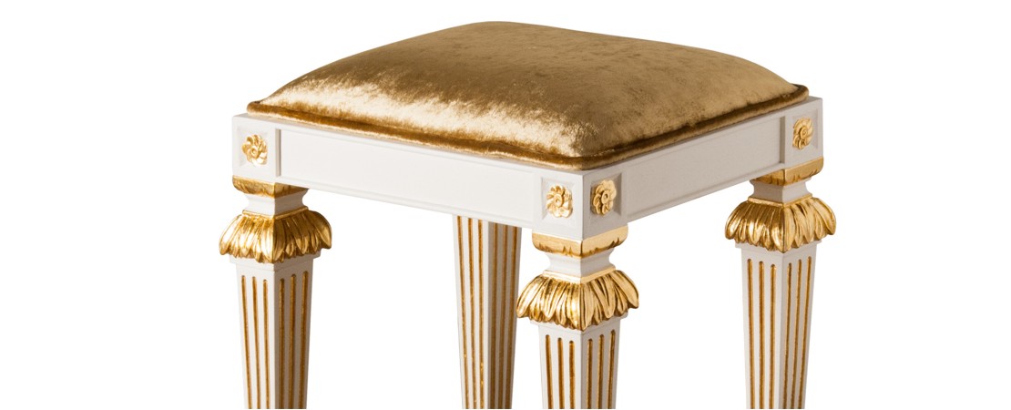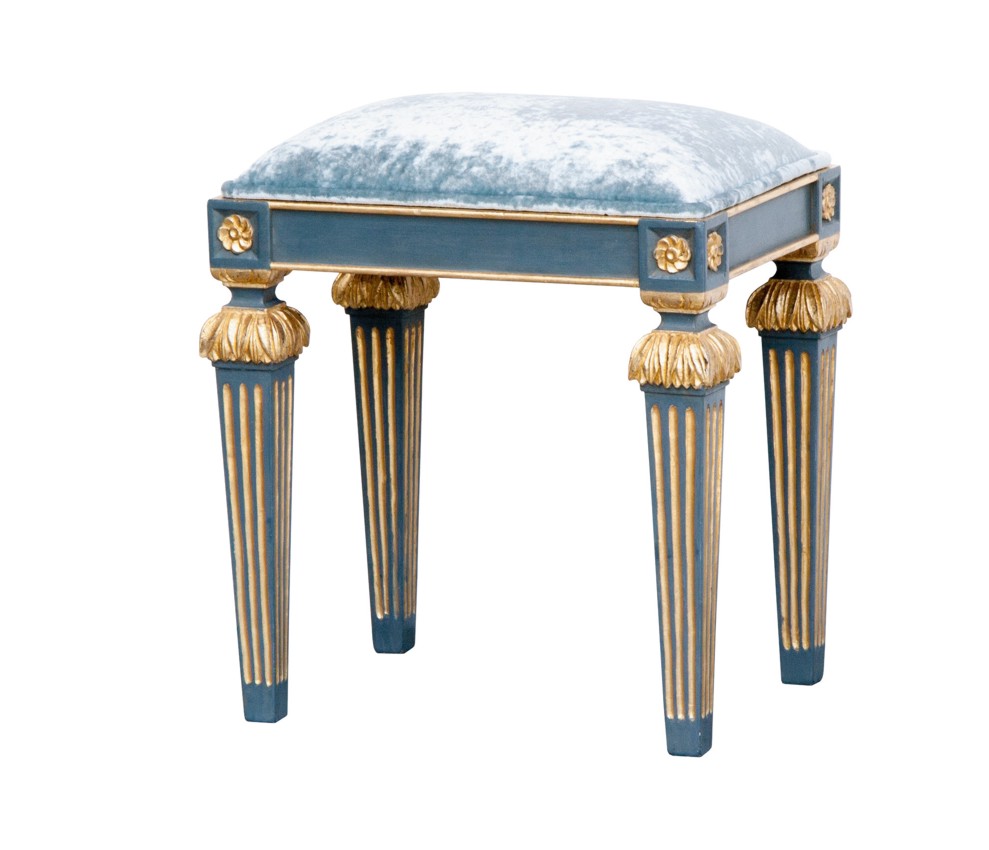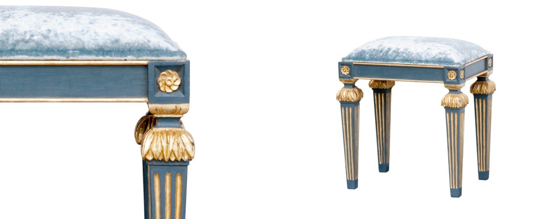 Sgabello in legno intagliato con seduta rivestita in velluto